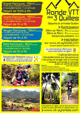 A noter dans vos agendas, la 11e Ronde VTT des 3 Quilles aura lieu le dimanche 2 octobre au départ de Quillan (11). Vous noterez qu'elle a lieu cette année le dimanche et non plus le samedi comme habituellement.